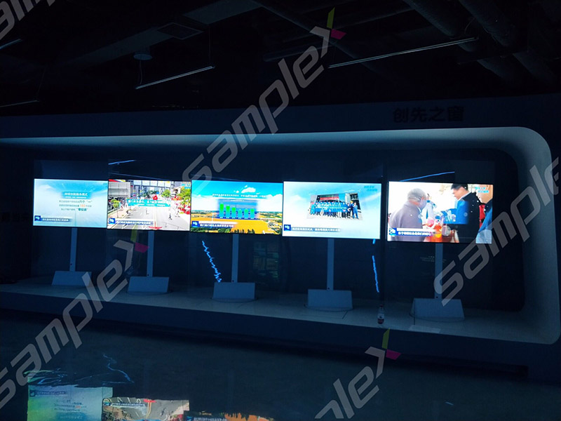 整個營業(yè)廳通過高科技的多媒體展示手段介紹電網(wǎng)的建設(shè)與發(fā)展歷程,多媒體展示可謂是花樣百出,有多媒體沙盤、液晶拼接墻、LED顯示屏、VR、電子圖表、互動櫥窗、虛擬成像、投影儀等等,展館現(xiàn)場讓人耳目一新的當選這一字排開貼在玻璃上的超薄OLED壁紙屏,展現(xiàn)的模式一改傳統(tǒng)的“一堵墻”,在空間利用率和創(chuàng)意展示方面來說OLED無疑是最佳的展示首選,每一塊屏都是一個獨立體,而又相互呼應(yīng),180°的旋轉(zhuǎn)功能,無論是整屏播放關(guān)于電網(wǎng)的發(fā)展歷程或是分屏展示智慧家庭改造、智能辦公環(huán)境及智能配電房監(jiān)控數(shù)據(jù)亦或是倡導(dǎo)科學(xué)用電的宣傳片等,讓參觀者全方位的觀看到電網(wǎng)給大家?guī)淼木手嗖⑶易尨蠹腋腥の兜牧私怆娏Φ倪^去、現(xiàn)在以及未來,從而更好的倡導(dǎo)科學(xué)用電理念。